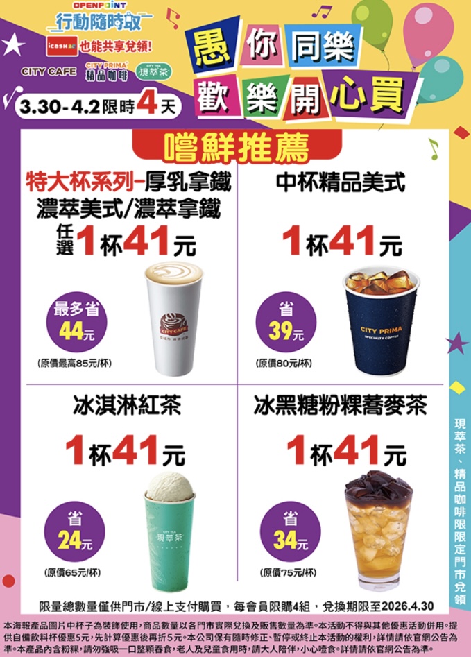 7-ELEVEN自4月1日起推出「愚人節WOW大賞」,集結鮮食、甜點、烘焙、冰品與CITY TEA、門市預購商品等,帶來逾20款話題爆品,趣味又美味,網友們準備玩心大發,吃了哇哇叫!OPENPOINT行動隨時取加碼祭出限時快閃活動,CITY系列指定飲品單杯只要41元,絕對不開玩笑一定要買!
